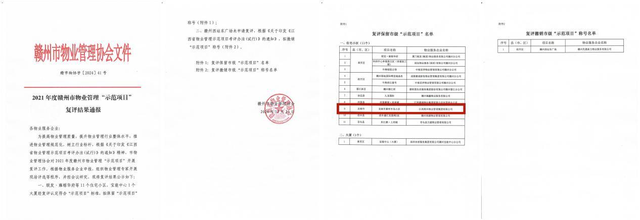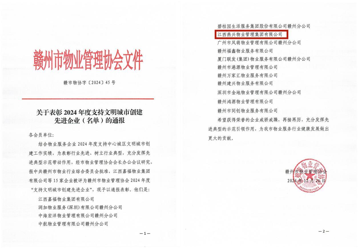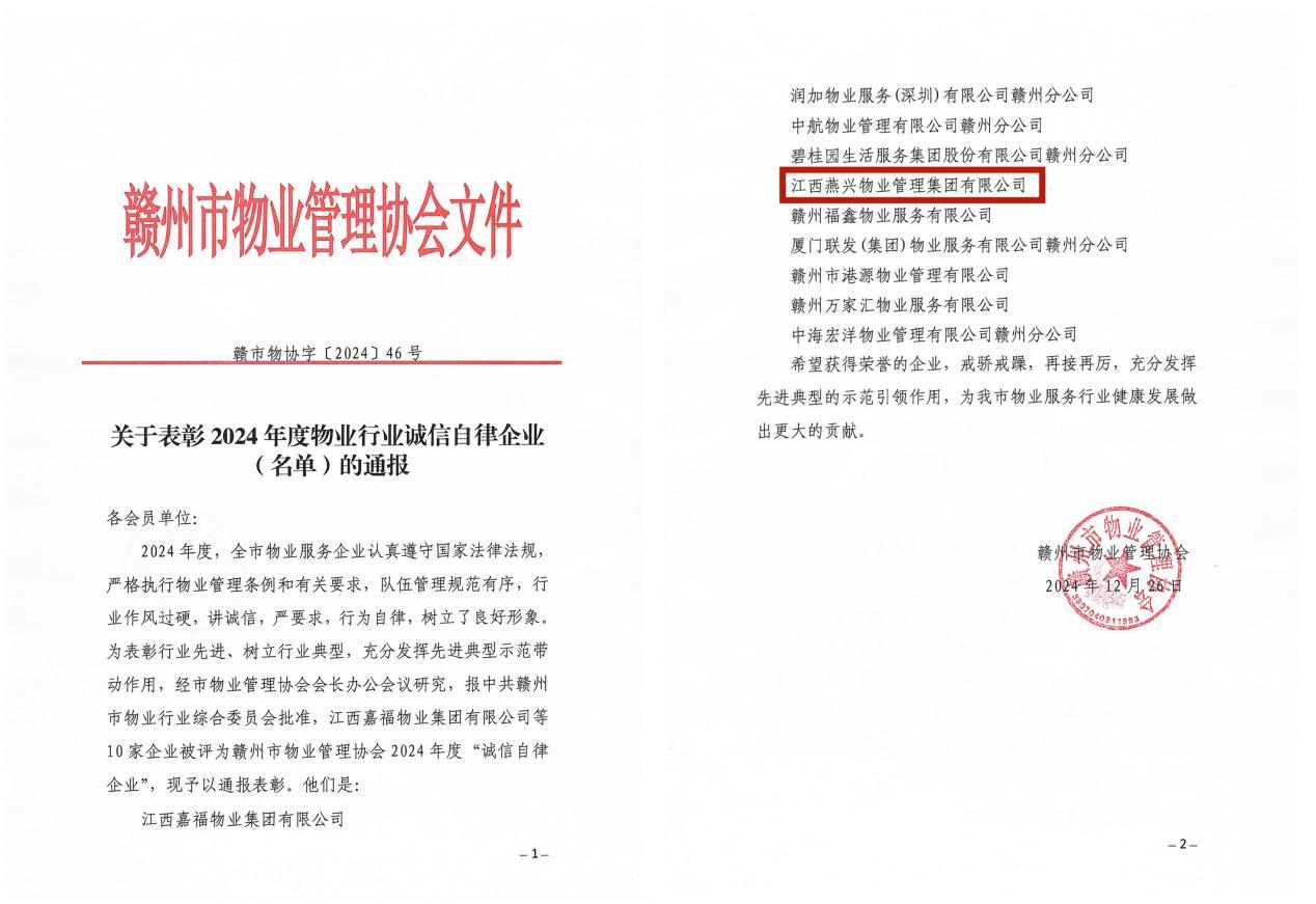 2025年元月7日,贛州市物業管理協會第五屆三次會員大會在贛州市格蘭云天國際酒店勝利召開,會上對2024年度優秀物業企業及個人進行了通報表彰。燕興物業喜獲贛州市“2024年度優秀物業企業”“2024年度誠信自律企業”“2024年度支持文明城市創建先進企業”榮譽稱號;龍南嘉和半島小區復評通過“贛州市優秀示范小區”,項目經理周群蓉喜獲“2024年度優秀物業項目經理”榮譽稱號,公園壹號小區物管員李小梅獲得“最美物業人”榮譽稱號。