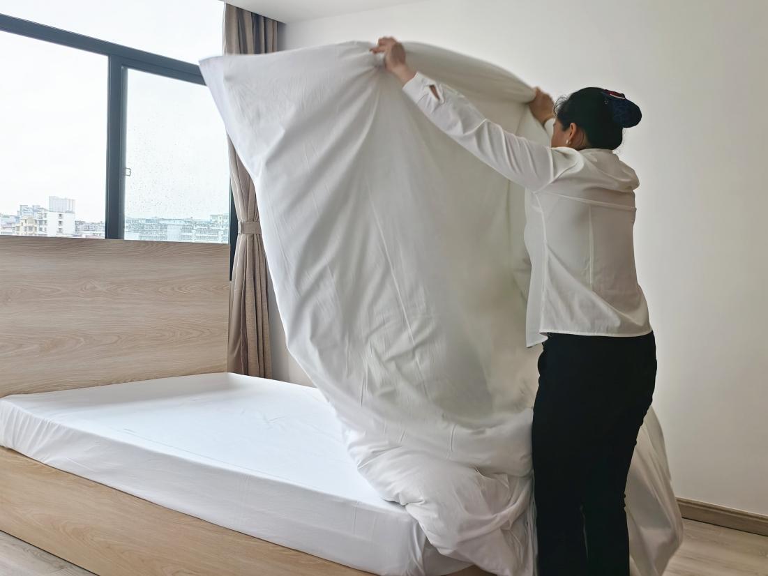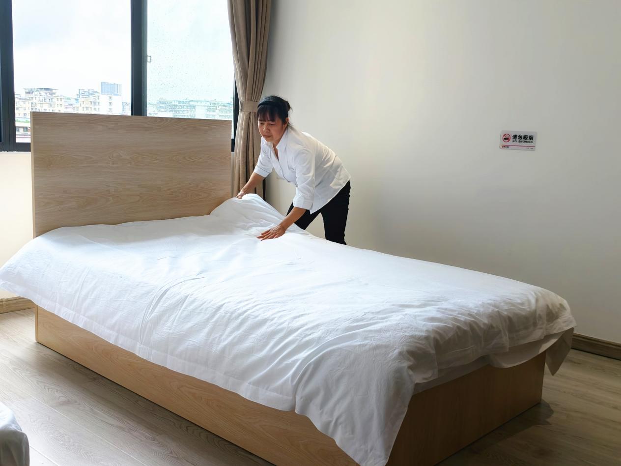 比賽現場,參賽服務員們迅速進入“戰斗”狀態,在緊張而有序的氛圍中大展身手。隨著一聲令下,他們動作嫻熟、一氣呵成:雙手輕揚,潔白的床單如靈動的蝶翼在空中翻飛,轉瞬便平整地鋪展在床上;緊接著,套被套、折被角,每一個步驟都精準到位,盡顯扎實功底。經選手們精心塑造,原本松散的被芯變得棱角分明、挺括有型,將標準化服務流程與藝術美感完美融合。評委們秉持公平公正原則,從操作規范程度、完成效率、細節處理等多個維度進行細致評分,不放過任何一個細節,確保賽事結果真實反映選手水 平。